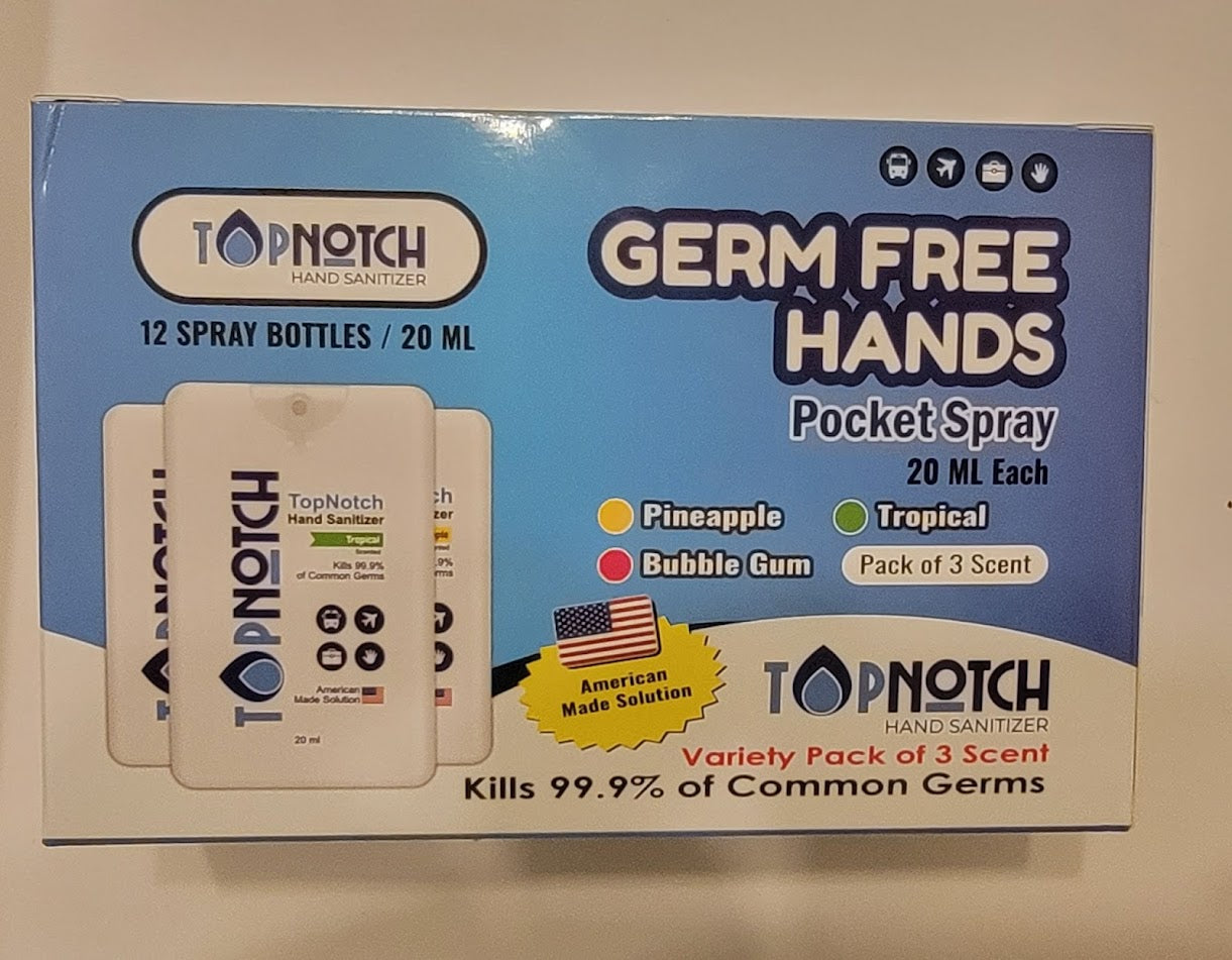 TopNotch Hand Sanitizer Card Size Spray – 20 ML (Variety Pack of 12) 4-Bubblegum 4-Tropical Scent / 4- Pineapple